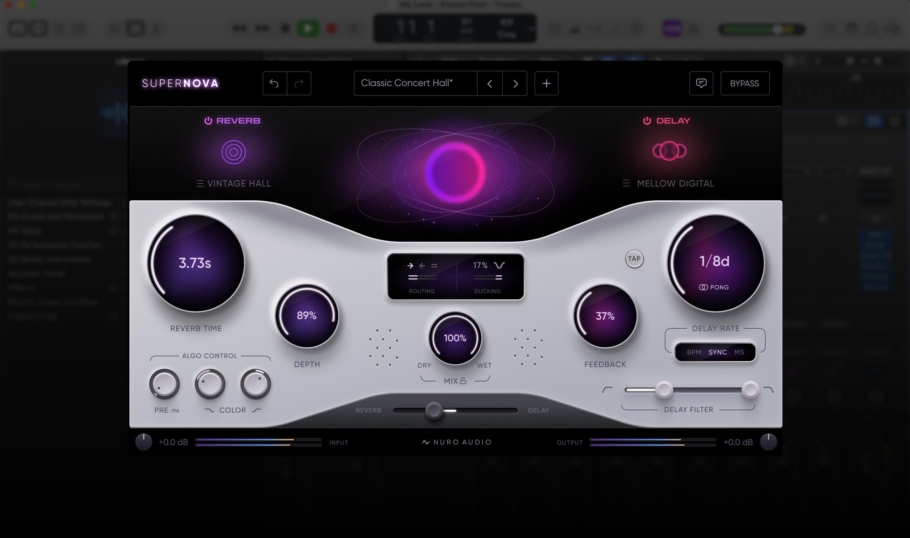Supernova features powerful routing controls - offering new sonic possibilities for your mix. Route the output of the delay into the output of the reverb with just a click. Or, send the output of the reverb engine into the input of the delay to add a sense of depth to your delays.