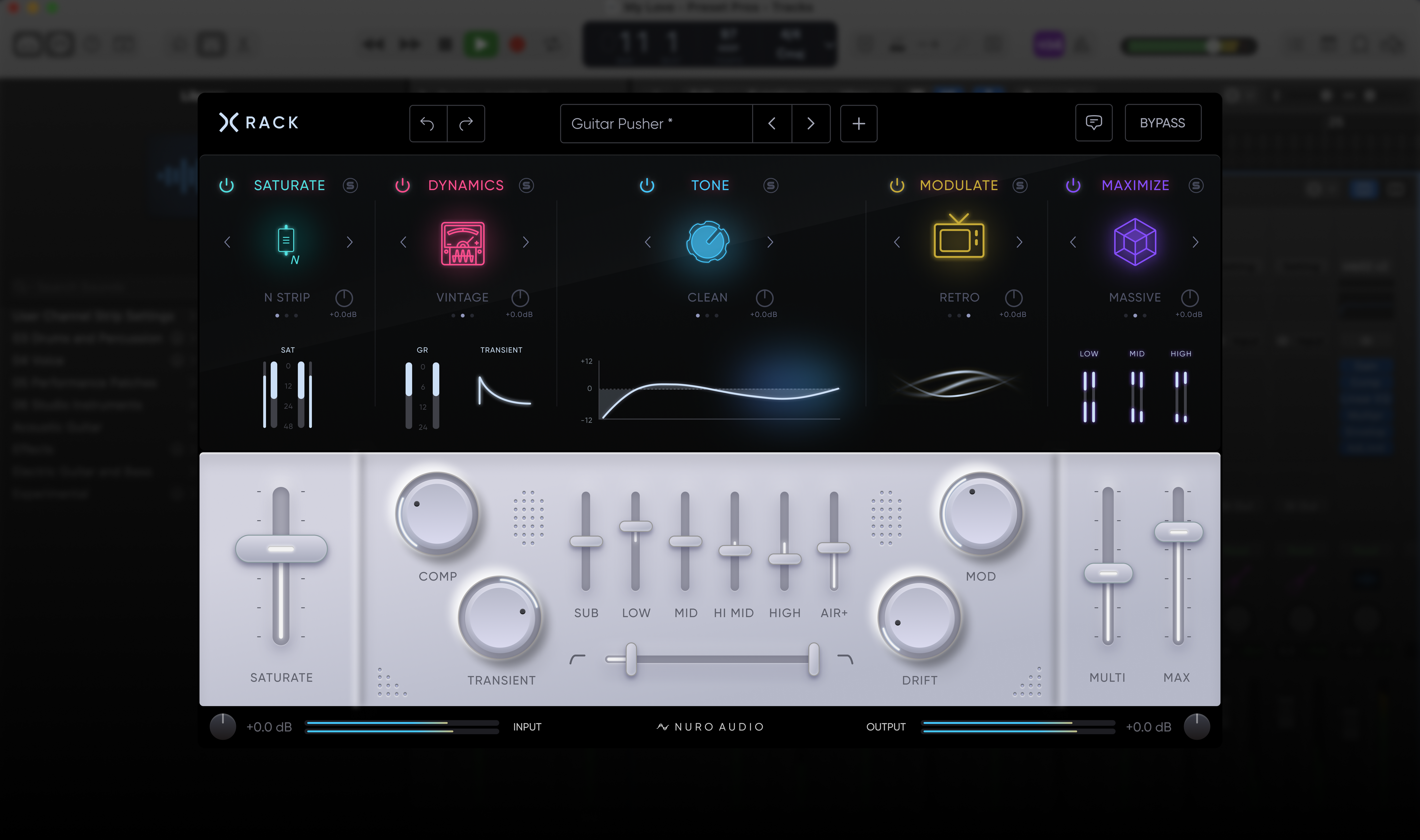 1 Testing conducted by Nuro Audio in October 2024 using macOS and Windows computers running Logic Pro (macOS), Ableton Live 12 (macOS and Windows), and Studio One (macOS and Windows), comparing multiple DAW CPU meters between Xrack/Xrack Pro and comparable 3rd-party plugin chains which included the same categories of processing found in Xrack and Xrack Pro (console emulation, analog-modeled compression, transient shaping, EQ, excitement, pitch drifting, modulation, multiband dynamics with upward and downward compression, wideband limiting, and clipping), where Xrack/Xrack Pro performed up to 3x lighter on CPU.
