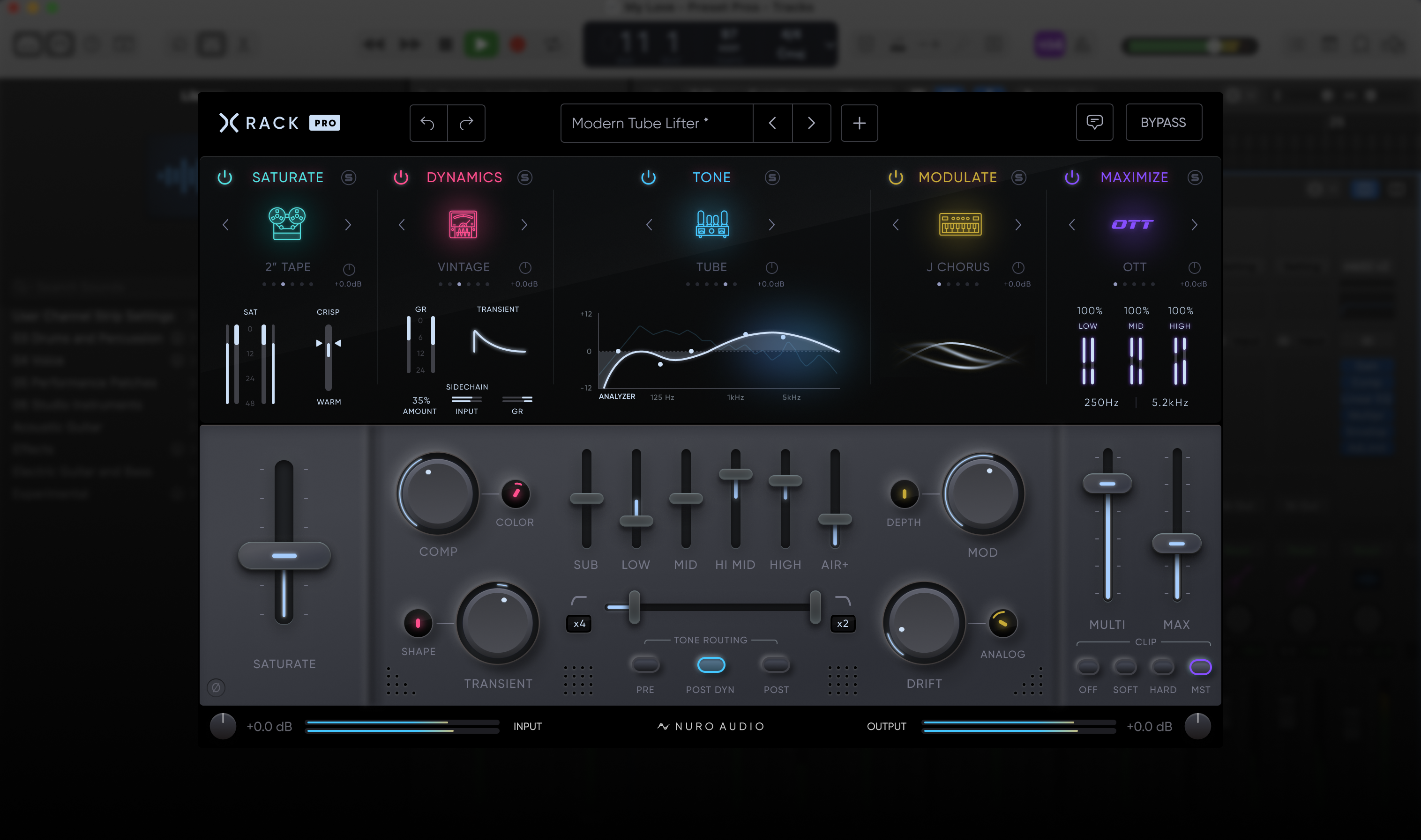 Xrack Pro features 37 next-gen algorithms, including console & tape saturation models, classic analog-modeled compressors, analog-matched tone curves, multi-band dynamics processors, and more. Explore the modes below.