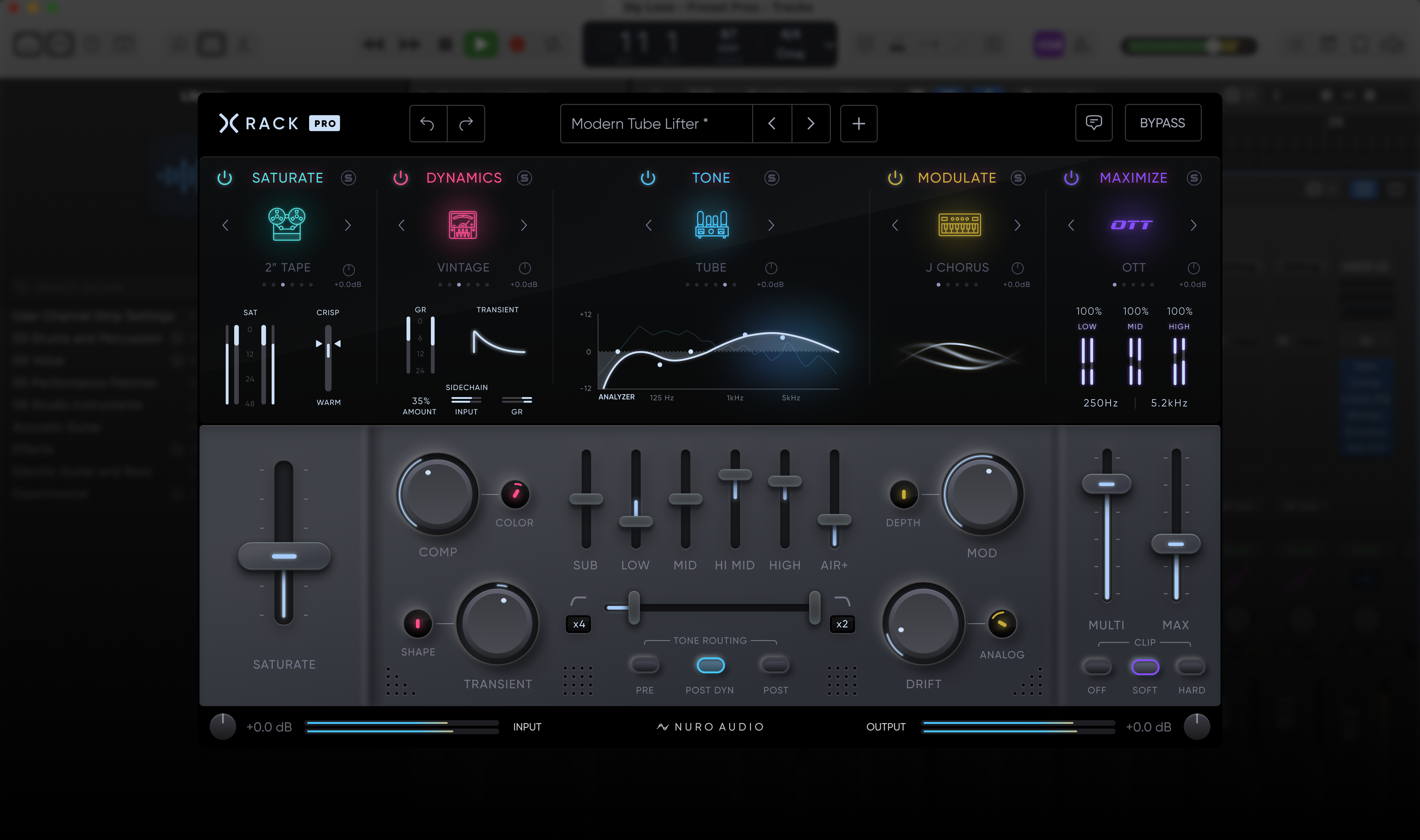 Xrack Pro features 28 next-gen algorithms, including console & tape saturation models, classic analog-modeled compressors, analog-matched tone curves, multi-band dynamics processors, and more. Explore the modes below.
